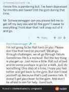 施瓦辛格回复网友 近日,有网友在社交平台表示喊话施瓦辛格,得到本尊的回应。该网友表示自己抑郁了很久没去健身,希望施瓦辛格骂醒ta让ta别再偷懒,ta就会立马去健身房。 施瓦...