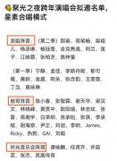 湖南卫视聚光之夜跨年演唱会拟邀名单曝光,大咖云集,登上热搜。多个阵营齐开火,粉丝直呼受不住。 芒果跨年夜晚会俨然已成为热门综艺的重聚地,6大综艺阵营的选手齐上阵。不...
